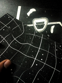 Soon, many bindis began appearing all around the sky like round stars. It was an inverted night, bright sky, black stars. The bindis spread rapidly and began merging, each like an inkblot. They were both very scared now but soon it wouldn’t matter. There was thunder that made it seem as though the world was inside the stomach of a giant.